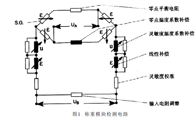 如圖1 所示, 檢測電路的功能是把電阻應變片的電阻變化轉變為電壓輸出。在所加橋壓U 不變的情況下, 傳感器輸出信號與作用在傳感器上的重力和供橋橋壓成正比, 而且, 供橋橋壓U 的變化直接影響電子稱的測量精度, 所以要求橋壓很穩定。因為惠斯登電橋具有很多優點, 如可以抑制溫度變化的影響, 可以抑制側向力干擾, 可以比較方便的解決稱重模塊的補償問題等, 所以惠斯登電橋在稱重模塊中得到了廣泛的應用。因為全橋式等臂電橋的靈敏度較高, 各臂參數一致,各種干擾的影響容易相互抵銷, 所以稱重模塊均采用全橋式等臂電橋。