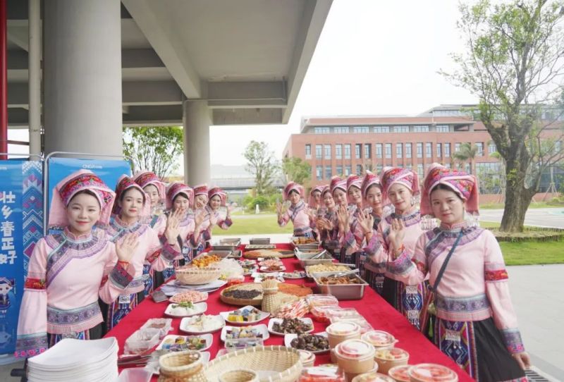 伴隨著此起彼伏、高遏行云的歌聲,另一邊的長桌美食盛宴也拉開帷幕,有象征吉祥如意、五谷豐登的五色糯米飯;有清香四溢、滿口香甜的各色水果;有清甜軟糯、蘊含著壯族人民對美好生活向往的粽子;還有各式各樣、滿口留香的面點......食材豐富,色香味俱佳,把壯鄉民俗特色展現得淋漓盡致。